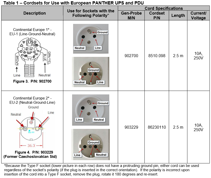 The current Panther power cord released for use with these sockets, Gen-Probe P/N: 902700 (Supplier P/N: 8510.098) is configured with the line pin on the left and neutral pin on the right, when looking at the plug with the ground slot on top (see figure 3). The Panther UPS has an audible alarm which activates if plugged into a power socket with a polarity that does not match that of its power inlet. On the Type F (Schuko) sockets, this can be corrected by unplugging and rotating the plug 180 degrees, and then reinserting into the socket. However, the Type E (French) sockets will not allow the plug to be repositioned in this manner due to the presence of an off-centered, protruding ground pin (see figure 1). In these instances, a cord with the opposite polarity is required. Gen-Probe P/N: 903229 (Supplier P/N: 86230110) has been released, which has the opposite polarity of P/N: 902700 and follows the polarity standard set by the former Czechoslovakia (see figure 4).
